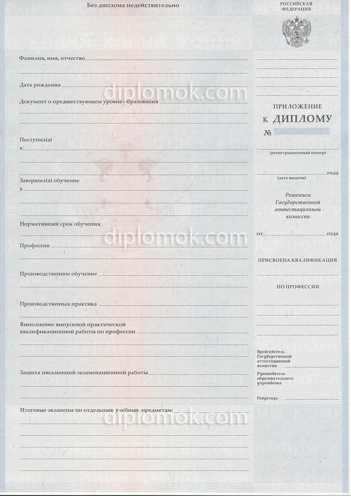 Диплом училища с выдачей в период с 2007 по 2010 год включительно, заполненный нашими специалистами по государственным стандартам, с печатью нужного ПТУ или ПТЛ и подписью его руководителя, секретаря и председателя аттестационной комиссии.
